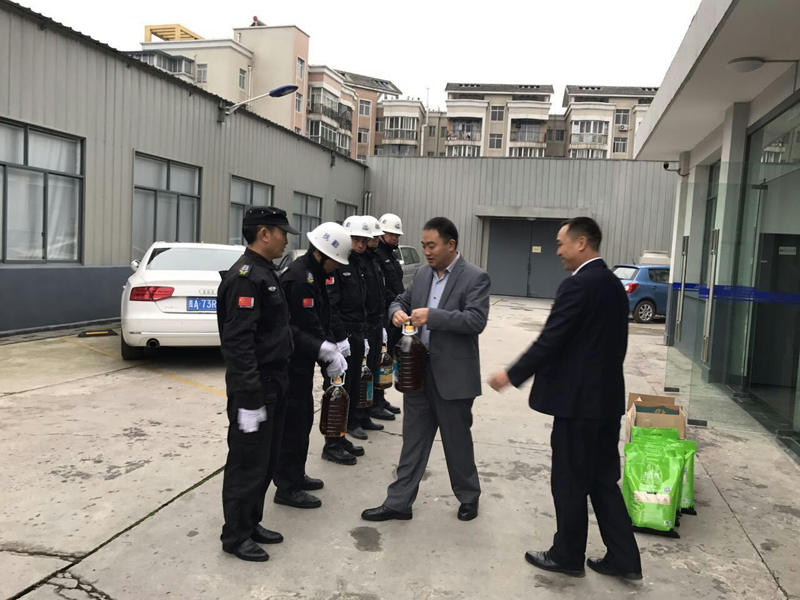 (陟翔集團股東代表王訓江和保安大隊長袁貴軍為各點保安員送上慰問品)