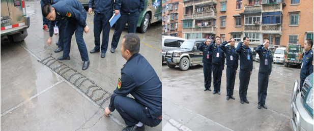 2015年12月11日,鎮(zhèn)東護運有限公司黔東南州分公司組織天柱守押中隊在農行大院舉行年終訓練成果匯報暨反恐消防演練,并邀請了縣公安局治安大隊、縣銀監(jiān)局、縣人民銀行、縣工行、縣農行、縣建行、縣電視臺等單位參加和觀看。訓練成果匯報內容主要包括反恐演練、隊列和擒敵術。反恐演練模擬運鈔車在網點送鈔時,押運員遭遇歹徒徒手搶槍;運鈔車網點收鈔時,解款員提箱返回上車過程中遭遇歹徒持刀搶劫;![]()